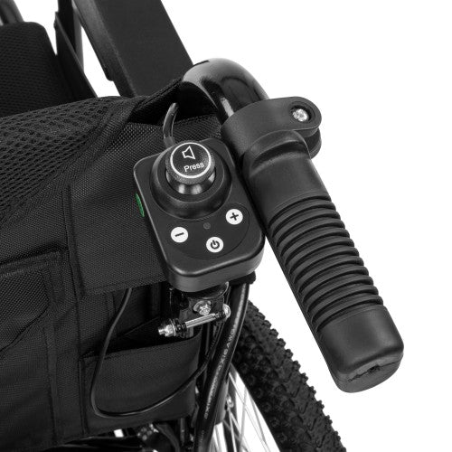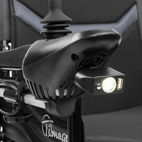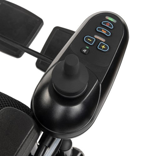 - Joystick control panel with speed adjustment, audible signals, LED lighting, and built-in USB charging port