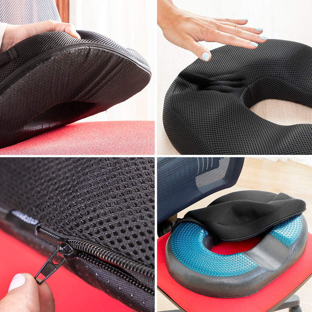 - Ergonomic, donut-shaped seat cushion designed to improve posture and reduce discomfort.