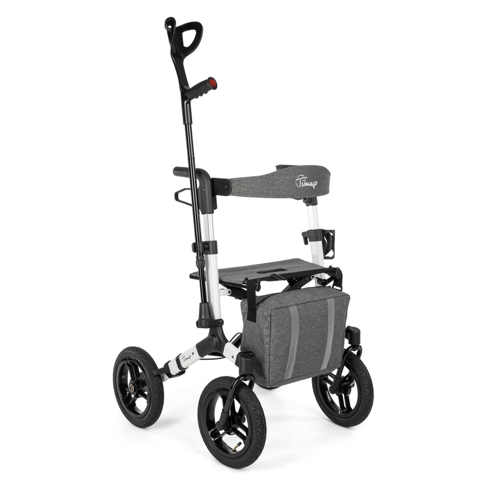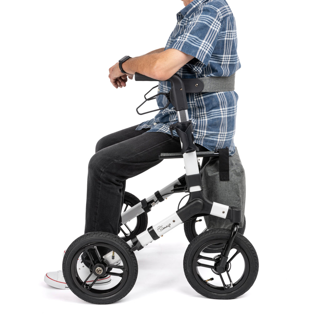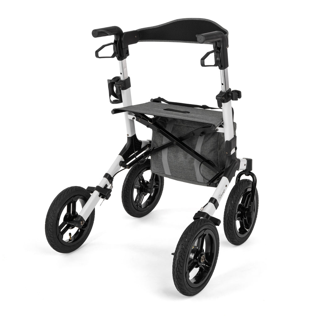 The RANGER is a wide-frame aluminium rollator with large 12-inch pneumatic wheels and a cross-over frame structure. Built for reliable outdoor performance on uneven terrain.