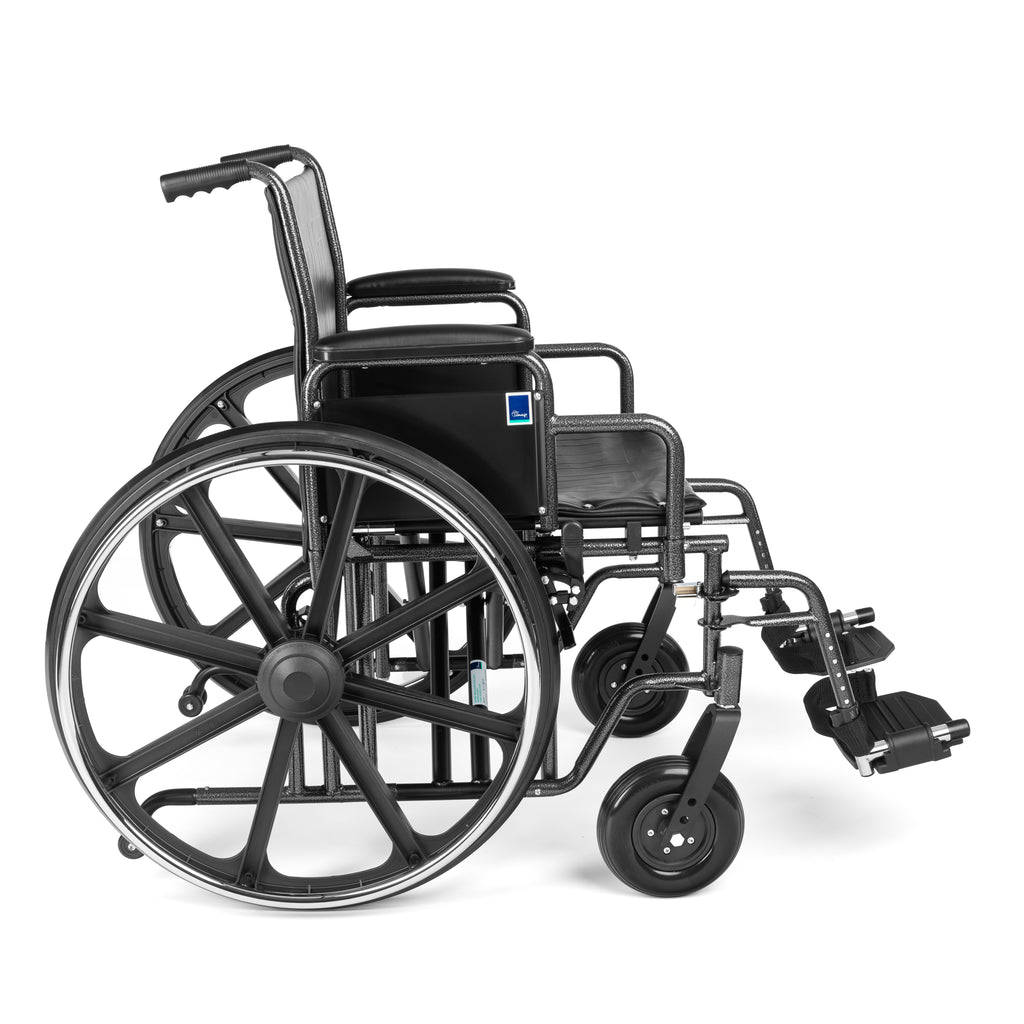 This heavy-duty reinforced steel wheelchair supports users up to 225 kg. The rigid steel frame provides excellent stability during transport and everyday use. Suitable for indoor and outdoor use on flat and paved surfaces.
